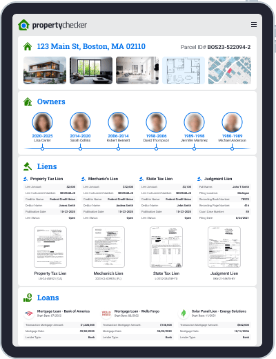 Go far beyond basic liens records. Property Checker delivers a powerful, all-in-one property report built from thousands of trusted public and private data sources, giving you deeper insights into ownership, financial history, property details, and more. Whether you're researching a property, verifying ownership, or exploring investment opportunities, our reports provide the critical data you need, all in one place.